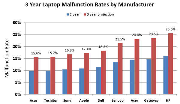 Et c’est Asus qui arriver en tête de liste avec un taux de 15,6%, preuve irréfutable de la robustesse de ses modèles. Il est suivi de près par les deux japonais Toshiba (15,7%) et Sony Vaio (16,8%), puis Apple 17,4% et HP qui arrive en fin de classement avec un taux de 25% de panne constatées.