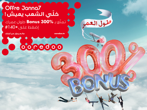 Ooredoo propose à tous ses clients prépayés une nouvelle offre: Janna7 qui leur accorde un Bonus systématique de 300% sur chaque recharge de 500 millimes et plus. Ce Bonus est utilisable vers tous les numéros Ooredoo ainsi que pour l’achat de forfaits Internet Mobile. L’offre Janna7 permet de nombreux autres avantages tels que :