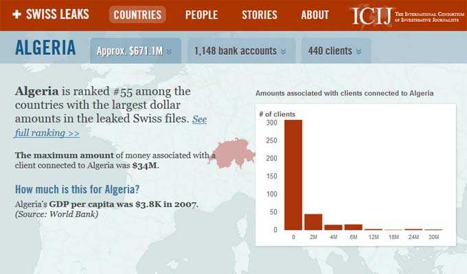 Au total, 440 clients liés à l’Algérie possèderaient des comptes chez HSBC Private Bank à Genève. Ils détiennent des avoirs estimés à plus de 671 millions de dollars. Les documents publiés ne révèlent pas pour l’instant les identités des Algériens impliqués dans ce scandale mondial.