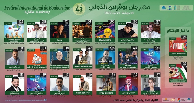 La programmation artistique de cette 43e édition promet d’être riche et variée, avec la présence d’artistes de renom tels que Zied Gharsa, Lotfi Bouchnak, Saber Rebaï, le duo Yuma, Mortadha Fettiti, Raouf Maher, Bassem Hamraoui ainsi que la comédienne Wajiha Jendoubi, qui sera à l’affiche de la pièce Big Bossa.