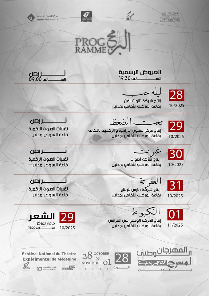 Médenine abrite la 28ème édition de son Festival National du théâtre expérimental du 28 octobre au 01 novembre 2025. Cette nouvelle édition est une “session en hommage à Anouar Chaafi” dont il est le fondateur.