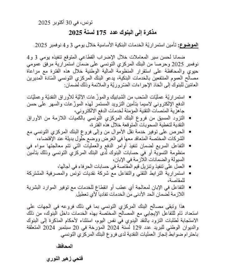 La BCT veut éviter un blocage du système financier durant la grève et appelle les banques à anticiper et organiser leurs services pour maintenir l’accès du public aux opérations bancaires essentielles.