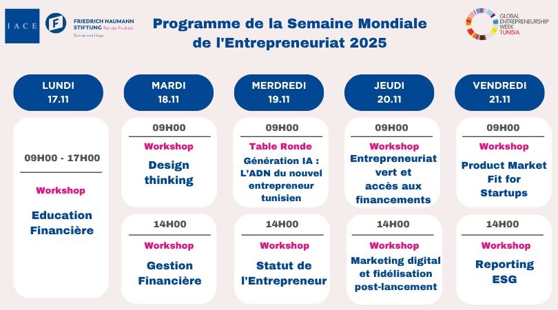 Global Entrepreneurship Week (GEW) ou la Semaine mondiale de l’entrepreneuriat; rendez-vous incontournable pour les jeunes entrepreneurs, les porteurs de projets et les acteurs économiques tunisiens, se tiendra du 17 au 21 novembre 2025 à Tunis.