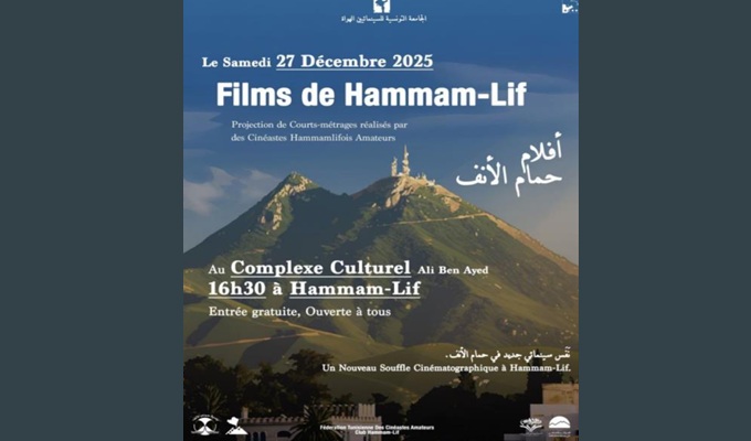 Le ciné-club de Hammam-Lif organise, avec le soutien de la municipalité de Hammam-Lif, une manifestation cinématographique intitulée “Hammam-Lif raconte ses histoires à l’écran”, le 27 décembre à 16h30, au Centre culturel Ali Ben Ayed.