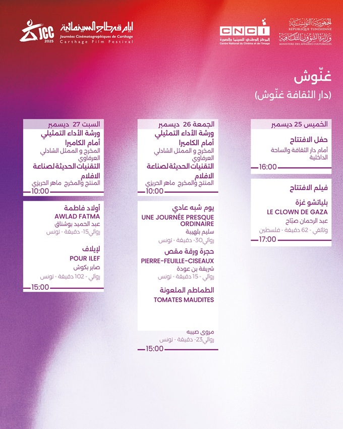 La délégation de Ghannouch au nord de Gabès, accueille pour la première fois du 25 au 27 décembre 2025, des projections des Journées cinématographiques de Carthage dans le cadre des JCC dans les régions, dans le cadre d’une initiative visant à soutenir la décentralisation culturelle au service du rayonnement du cinéma tunisien dans les diverses régions du pays.
