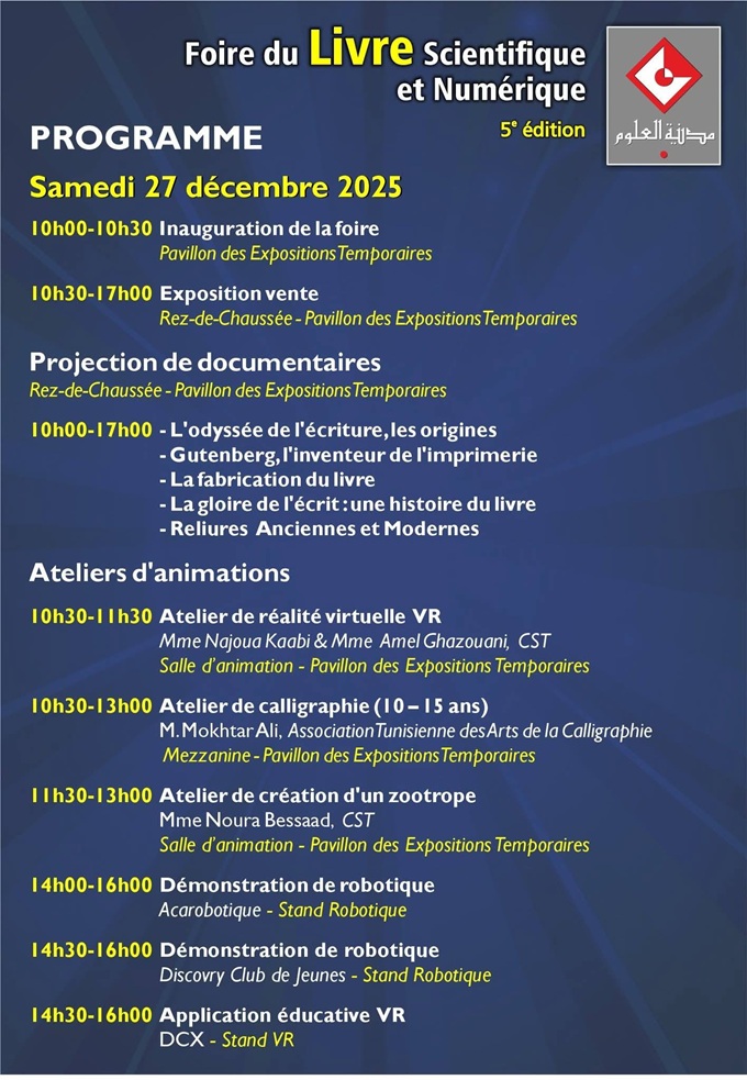 La Foire du Livre Scientifique et Numérique revient à la Cité des Sciences à Tunis en décembre 2025. La CST organise les 27 et 28 décembre 2025 la 5ᵉ édition de sa Foire du Livre Scientifique et Numérique, un événement désormais incontournable dans le paysage culturel et scientifique tunisien.