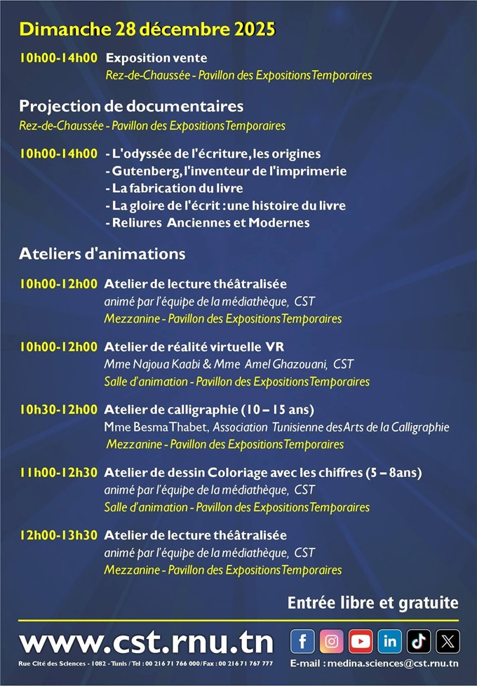 Organisée dans un esprit d’ouverture et de partage, cette foire constitue une occasion unique d’explorer l’univers du livre scientifique et du numérique et de renforcer le lien entre science, culture et société. Un rendez-vous culturel et éducatif à ne pas manquer à la fin de l’année 2025 à la Cité des Sciences de Tunis.