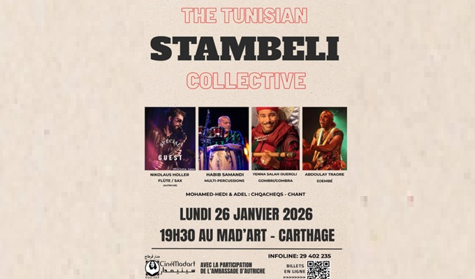 The Tunisian Stambeli Collective invite le jazzman autrichien Nikolaus Holler pour un concert exceptionnel organisé avec la participation de l’ambassade d’Autriche en Tunisie, lundi 26 janvier 2026 à 19h30 sur la scène de l’espace culturel Mad’art Carthage.
