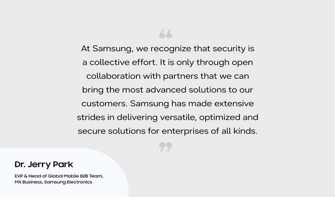 Chez Samsung, nous reconnaissons que la sécurité est un effort collectif. Ce n’est que grâce à une collaboration ouverte avec nos partenaires que nous pouvons apporter les solutions les plus avancées à nos clients. Tout au long de ma carrière au sein de Samsung, nous avons fait des progrès considérables en proposant des solutions polyvalentes, optimisées et sécurisées pour toutes sortes d’entreprises.