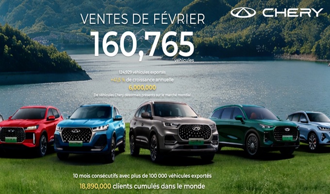 Chery poursuit son expansion internationale avec des performances remarquables en février 2026. Le constructeur a enregistré 160 765 véhicules vendus sur les deux premiers mois de l’année 2026, soit une hausse de 41,5 % par rapport à la même période l’année dernière.