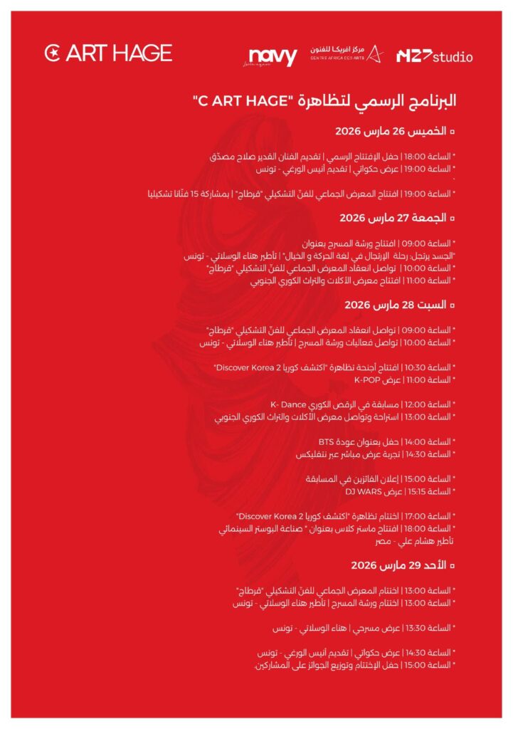 Le coup d’envoi de C ART HAGE 2026 sera donné le jeudi 26 mars avec une cérémonie d’ouverture animée par l’artiste Salah Mosddek, suivie d’un spectacle de conte proposé par Anis Ouergui.