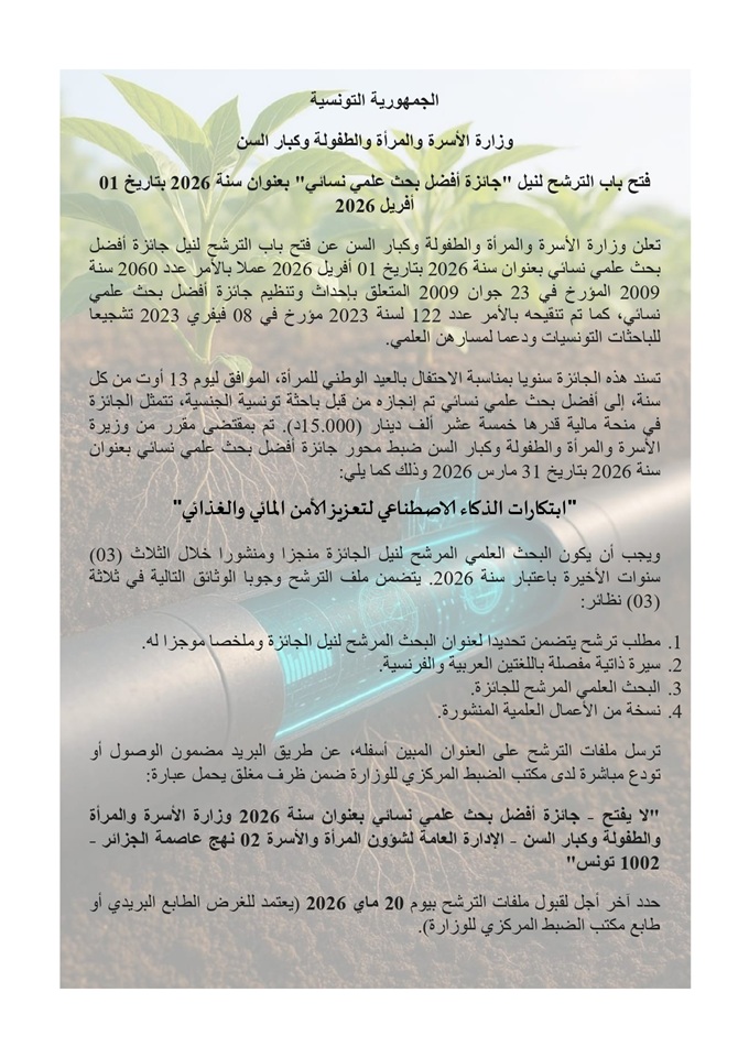 Attribué annuellement à l’occasion de la célébration de la Fête nationale de la femme (le 13 août), ce prix consiste en une récompense financière de 15 mille dinars. L’appel à candidature pour le prix de la meilleure recherche scientifique féminine au titre de 2026 :