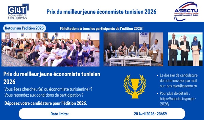 L’Association des Économistes Tunisiens (ASECTU) et le Global Institute for Transition (GI4T), organisent la 2e édition du Prix du meilleur jeune économiste tunisien. Cette initiative vise à valoriser l’excellence de la recherche académique tunisienne, à favoriser la diffusion des travaux des jeunes économistes au-delà des cercles universitaires et à encourager leur engagement dans le débat public.