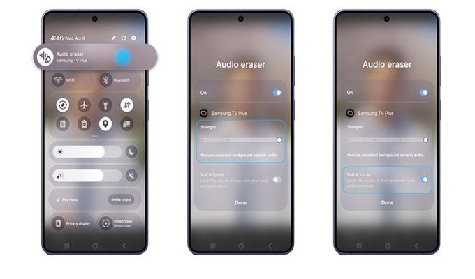 Accédez à la Gomme Audio via le panneau des Paramètres Rapides, ajustez l’intensité et activez le mode Voice Focus sur la série Galaxy S26.
